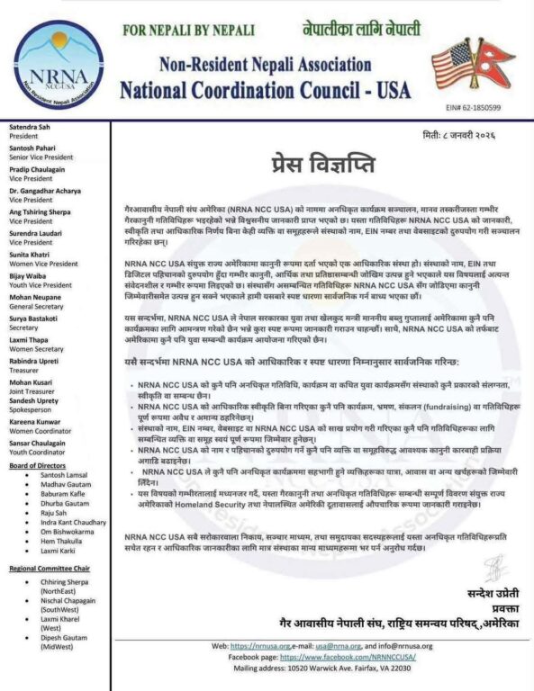 एनआरएनए एनसीसी यूएसएले आफ्नो नाम, ईआईएन नम्बर र आधिकारिक वेबसाइटको दुरुपयोग गरी अनधिकृत कार्यक्रम तथा मानव तस्करीजस्ता गैरकानुनी गतिविधि भइरहेको विश्वसनीय जानकारी प्राप्त भएको उल्लेख गरेको छ । साथै, संस्थाले आधिकारिक स्वीकृतिबिनाका कुनै पनि कार्यक्रम, भ्रमण वा फन्डरेजिङ अवैध र अमान्य हुने स्पष्ट पारेको छ ।