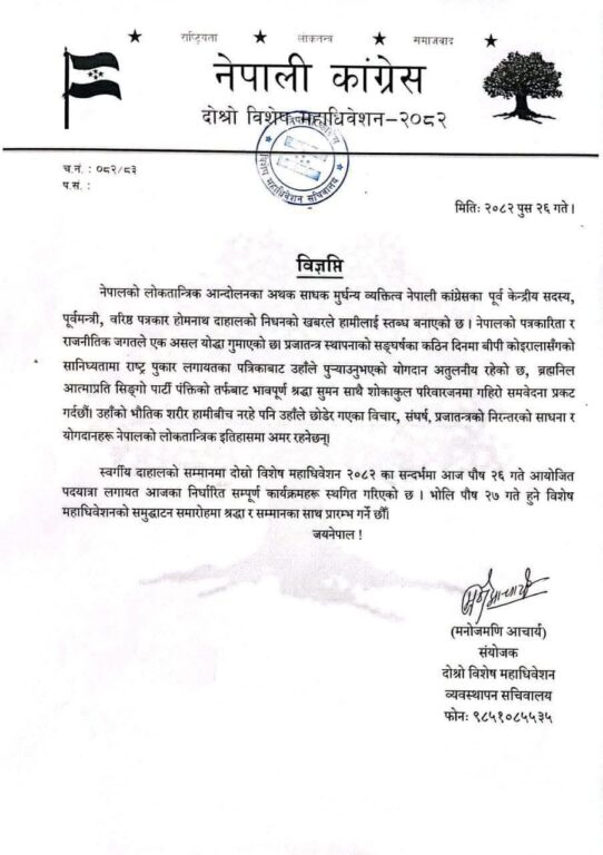 ‘नेपालको पत्रकारिता र राजनीतिक जगतले एक असल योद्धा गुमाएको छ। प्रजातन्त्र स्थापनाको सङ्घर्षका कठिन दिनमा बीपी कोइरालासँगको सानिध्यतामा राष्ट्र पुकार लगायतका पत्रिकाबाट उहाँले पुर्याउनुभएको योगदान अतुलनीय रहेको छ,’ विज्ञप्तिमा उल्लेख गरिएको छ।