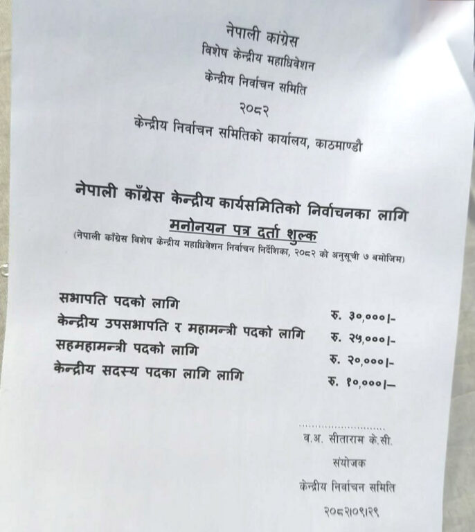 महाधिवेशनमा सभापति पदको उम्मेदवारी दर्ता गर्न ३० हजार शुल्क लाग्ने निर्वाचन समितिले जनाएको छ। यस्तै, उपसभापति र महामन्त्री पदका लागि २५ हजार तथा सहमहामन्त्री पदका लागि २० हजार शुल्क तोकिएको छ। यस्तै केन्द्रीय सदस्य पदका लागि १० हजार रुपैयाँ शुल्क लाग्ने भएको छ।