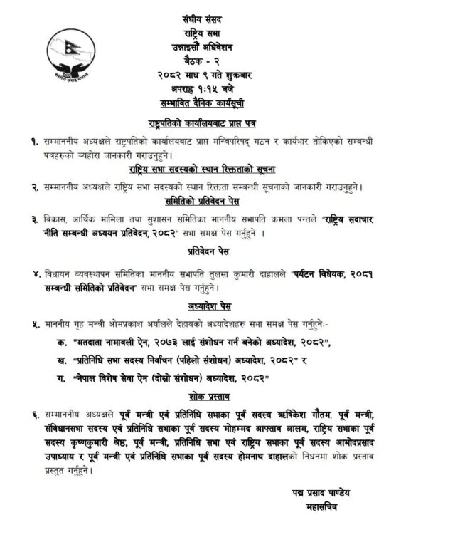 त्यस्तै विकास, आर्थिक मामिला तथा सुशासन समितिका सभापति कमला पन्तले राष्ट्रिय सदाचार नीति सम्बन्धी अध्ययन प्रतिवेदन, २०८२ सभा समक्ष पेस गर्ने, विधायन व्यवस्थापन समितिका सभापति तुलसाकुमारी दाहालले पर्यटन विधेयक, २०८१ सम्बन्धी समितिको प्रतिवेदन सभा समक्ष पेस गर्ने कार्यसूचीमा उल्लेख छ ।