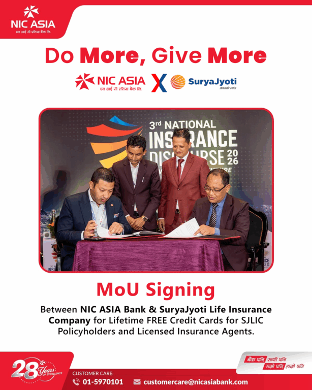 काठमाडौं-एनआईसी एशिया बैंक र सूर्यज्योति लाइफ इन्स्योरेन्स कम्पनीबीच सूर्यज्योति लाइफ इन्स्योरेन्सका बीमित र बीमा अभिकर्ताहरूलाई यस बैंकले लाइफ टाइम निःशुल्क क्रेडिट कार्ड सेवा प्रदान गर्ने सम्बन्धी एक रणनीतिक साझेदारी गर्ने समझदारी भएको छ ।