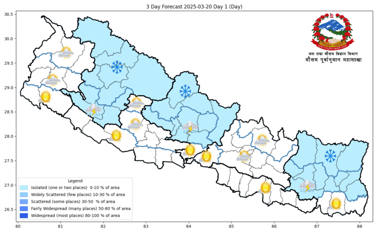 देशका तराई भू–भागमा हुस्सु÷कुहिरोको प्रभाव रहने साथै सबै हिमाली भागका केही स्थानमा हल्कादेखि मध्यम हिमपात र वर्षाको सम्भावना रहेकाले ती भूभागमा चिसो बढ्ने तथा दैनिक जनजीवन, पर्यटन, पदयात्रा , स्वास्थ्य साथै हवाई तथा सडक यातायातमा प्रभाव पर्ने देखिएकाले आवश्यक सतर्कता अपनाउनहुन महाशाखाले अनुरोध गरेको छ ।