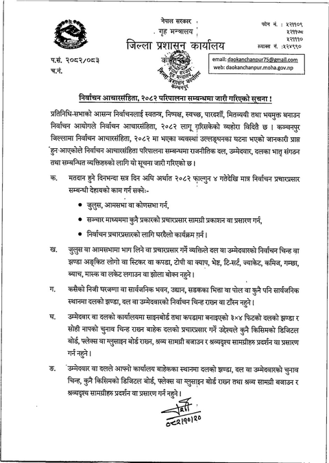 काठमाडौँ-जिल्ला प्रशासन कार्यालय कञ्चनपुरले निर्वाचन आचारसंहिता उल्लंघन नगर्न राजनीतिक दल, उम्मेदवार तथा सरोकारवाला सबैलाई आग्रह गरेको छ।