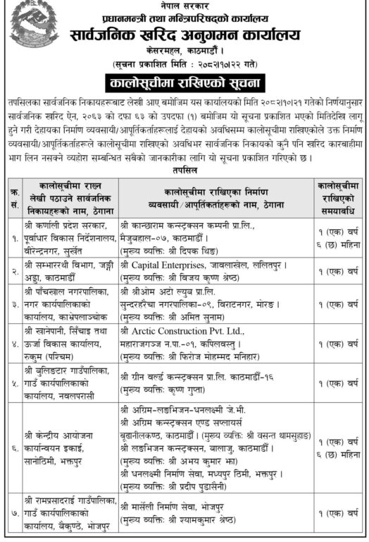 काठमाडौँ-सार्वजनिक खरिद अनुगमन कार्यालयले विभिन्न ९ वटा निर्माण व्यवसायी तथा आपूर्तिकर्ताहरूलाई कालोसूचीमा राखेको छ।