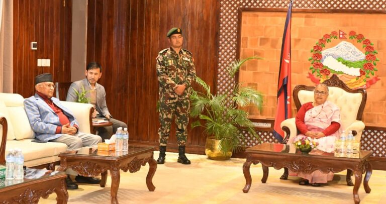 काठमाडौँ-प्रधानमन्त्री सुशीला कार्की र नेकपा एमालेका अध्यक्ष केपी शर्मा ओलीबीच भेटवार्ता भएको छ। बिहीबार बिहान प्रधानमन्त्रीको सरकारी निवास बालुवाटारमा प्रधानमन्त्री कार्की र अध्यक्ष ओलीबीच झन्डै २ घण्टा कुराकानी भएको हो।