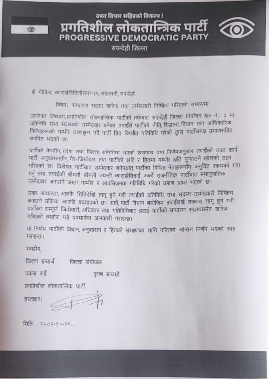 बुटवल-प्रगतिशिल लोकतान्त्रिक पार्टी (प्रलोपा) बाट रुपन्देही–३ मा प्रतिनिधिसभा सदस्य उम्मेदवार गोविन्द काराखेतीलाई पार्टीबाट निष्कासित भएका छन्।