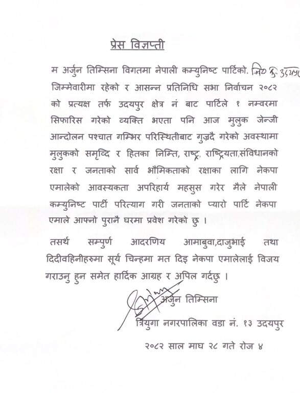 तिम्सिनाको विज्ञप्तिमा भनिएको छ– ‘जेनजी आन्दोलन पश्चात मुलुक गम्भीर परिस्थितिबाट गुज्रिरहेको छ। यस्तो अवस्थामा राष्ट्रियता, संविधानको रक्षा र समृद्धिका लागि नेकपा (एमाले)को आवश्यकता अपरिहार्य महसुस गर्दै म आफ्नो पुरानो घर फर्किएको हुँ।’
