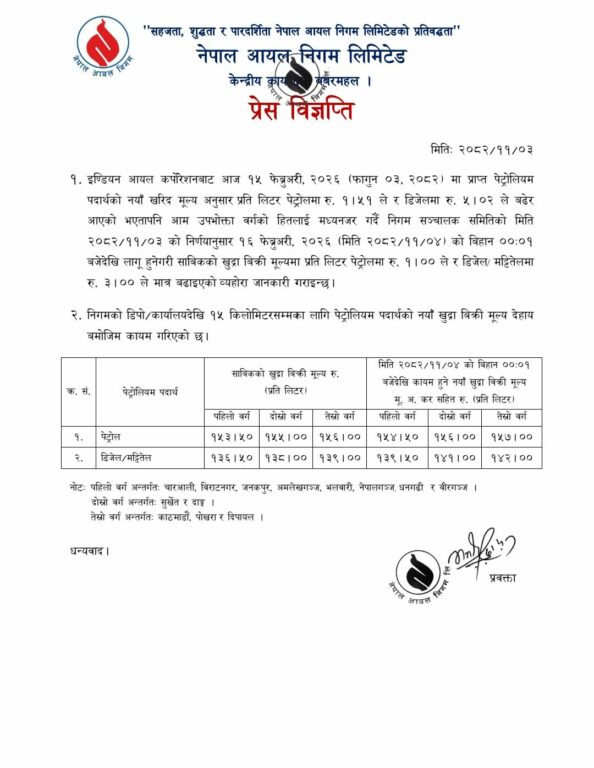 आयोगका अनुसार, पेट्रोलमा १ र डिजेल÷मट्टितेलको मूल्य ३ रुपैयाँले बढेको छ।
