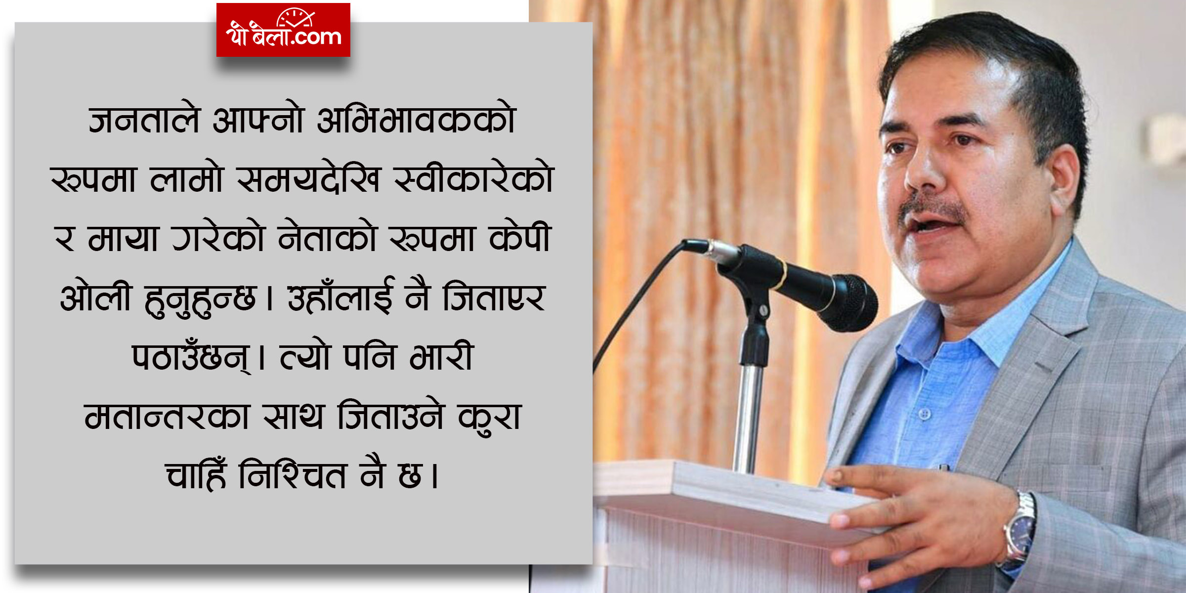 यो चुनावको इपि सेन्टरको रूपमा खासगरी मिडियाहरूले प्रचार गर्नुभयो। वास्तवमा यो इपि सेन्टर त्यस्तो होइन। चुनाव सवै निर्वाचन क्षेत्रमा उही ढङ्गले हुने हो र उस्तै जनताको प्रतिनिधित्व गर्दै हरेक हरेक निर्वाचन क्षेत्रमा उम्मेद्वारहरू विजयी हुने हो। त्यसभित्रको फरक पाटो चाहिँ यहाँ हाम्रो पार्टीका अध्यक्ष उम्मेदवार हुनुहुन्छ र अरू प्रतिस्पर्धीहरू चाहिँ त्यो उचाइमा रहनुभको छैन। एकजना जो काठमाडौँको मेयर हुनुहुन्थ्यो, उहाँ यहाँ आउनुभयो। उहाँलाई त सजिलो छ, केपी शर्मा ओलीसँग प्रतिस्पर्धा गरेर चुनाव हारे पनि केही फरक परेन। आफूलाई हाइलाइट गरिदिन्छ भन्ने हिसाबले उहाँ आउनुभएको हो। त्यसै कारणले मान्छेले काठमाडौँदेखि यहाँ आउनु भएको ठानेर अलिक चर्चा भाको स्थिति हो। जो मान्छे जहाँको जनतासँग जोडिएको हुन्छ, जनताले जहाँ अपनत्व महसुस गरेको हुन्छ, त्यहीँ चुनाव लड्ने हो। हाम्रो पार्टीमा पनि हरेक ठाउँमा टिकट दिँदाखेरि के हुन्छ भने त्यो ठाउँको मान्छे हो कि होइन ? त्यो ठाउँका जनतासँग कति घुलमिल गरेको छ र जनताका खास समस्या पर्दाखेरि त्यसले कसरी प्रतिधित्व गर्छ भन्नेसम्म हेरिन्छ। तर यो ठिक उल्टो भाछ। न यहाँको जनतासँग उहाँको साइनो सम्बन्ध छ। सायद उहाँ पहिलो पटक नै उम्मेदवारको बन्नको लागि मात्रै यो ठाउँमा आउनुभएको छ। यहाँको जनताले आफ्नो नेताको रूपमा अपनत्व महसुस गरेको अवस्था पनि होइन, चिनेको अवस्था पनि होइन। अहिले पनि उहाँका चुनाव प्रचारको शैली देखिन्छ कि, जनताका प्रश्नहरूको सामना गर्ने होइन, प्रश्नबाट भाग्ने र अँध्यारो कोठामा बसेर सामाजिक सञ्जाल प्रयोग गर्दै जनतालाई दिगभ्रमित गर्ने काम गरिएको छ। जनताका प्रश्नबाट भाग्नेहरु कसरी जनताबाट अनुमोदन हुन सक्छन् ? त्यही कारणले बढी चर्चा भएको हो। तर यो क्षेत्र इपि सेन्टर होइन, हाम्रो पार्टीका अध्यक्ष विरूद्ध प्रयोग गरिएको विभिन्न यो आक्षेप कुरा हो। जनताको बीचमा त्यस्तो खालको परिस्थिति छैन। जनताले चाहिँ आफ्नो अभिभावकको रूपमा लामो समयदेखि स्वीकारेको र माया गरेको नेताको रूपमा केपी ओली हुनुहुन्छ। उहाँलाई नै जिताएर पठाउँछन्। त्यो पनि भारी मतान्तरका साथ जिताउने कुरा चाहिँ निश्चित नै छ।