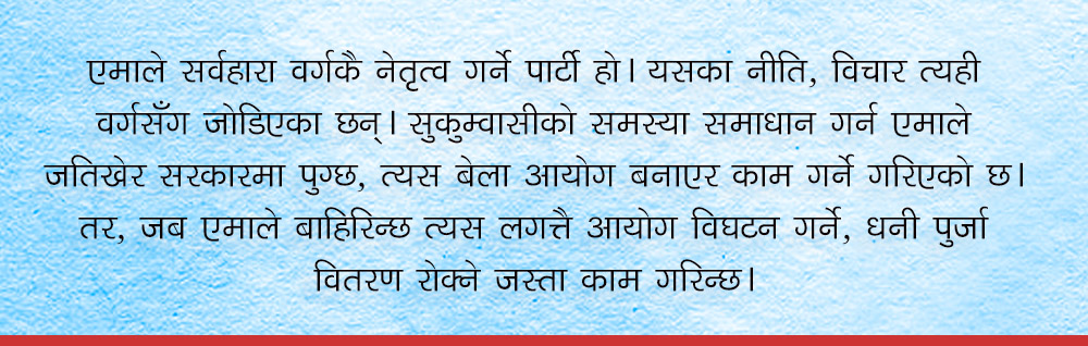 त्यो वास्तविकता होइन। एमाले सर्वहारा वर्गकै नेतृत्व गर्ने पार्टी हो। यसका नीति, विचारहरू त्यही वर्गसँग जोडिएका छन्। सुकुम्बासीहरूको समस्या समाधान गर्न एमाले जतिखेर सरकारमा पुग्छ त्यस बेला आयोग बनाएर काम गर्ने गरिएको छ। तर जव एमाले सरकारबाट बाहिरिन्छ त्यस लगत्तै आयोग विघटन गर्ने, धनीपुर्जा वितरण रोक्ने जस्ता काम गरिन्छ। पछिल्लो पटक पनि भुमिहिन तथा अव्यवस्थित बसोबासीहरुको समस्या समाधान गर्न आयोग बनाईएको थियो। विभिन्न जिल्लामा आयोगले काम गरि रहेको थियो। धनीपुर्जाहरु वितरण भई रहेका थिए। तर एमाले नेतृत्वको सरकार ढाल्ने वित्तिकै जेन्जी आन्दोलनको आडमा बनेको भनिएको सरकारले काम चाँहि त्यहि सर्वहाराको समस्या समाधान गरि रहेको आयोग विघटनबाट थाल्यो। पछि अदालतले त आयोग व्युँत्यायो । तर सरकारको असहयोगका कारण काम हुन सकि रहेको छैन।