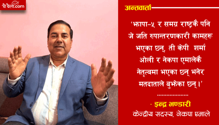 नेकपा एमालेका केन्द्रीय सदस्य इन्द्र भण्डारीले लामो समय पार्टीको सम्पर्क तथा समन्वयको क्षेत्रमा काम गर्नु भयो। झापा दमकका स्थायी बासिन्दा भण्डारी पार्टी भित्रको अन्तर समन्वय गर्ने/गराउने कार्यमा अभ्यस्त मानिनु हुन्छ। हाल उहाँ नेकपा एमालेका केन्द्रीय अध्यक्ष केपी शर्मा ओलीको उम्मेद्वारी रहेको झापा क्षेत्र-५ को सञ्चार संयोजक हुनुहुन्छ। यहाँको निर्वाचनलाई देश र विदेशबाट समेत चासोपूर्वक हेरिरहेको अवस्थामा कसरी चुनावी कार्यक्रमहरू भइरहेका छन् भनेर उहाँसँग कुराकानी गरेका छौं। प्रस्तुत छ, एमाले केन्द्रीय सदस्य एवम् झापा निर्वाचन क्षेत्र-५ का चुनाव प्रचार-प्रसार समिति संयोजक भण्डारीसँग टिकाराम उप्रेतीले गर्नुभएको कुराकानीको अंशः
