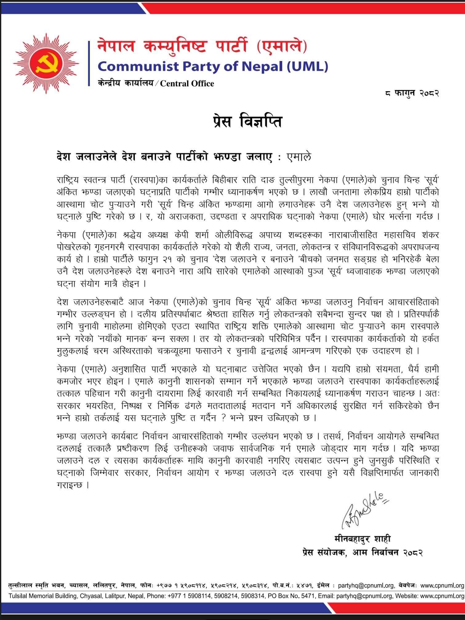 विज्ञप्तिमा भनिएको छ, ‘लाखौं जनतामा लोकप्रिय हाम्रो पार्टीको आस्थामा चोट पुऱ्याउने गरी ‘सूर्य’ चिन्ह अंकित झण्डामा आगो लगाउनेहरू उनै देश जलाउनेहरू हुन् भन्ने यो घट्नाले पुष्टि गरेको छ। र, यो अराजकता, उद्दण्डता र अपराधिक घट्नाको नेकपा (एमाले) घोर भर्त्सना गर्दछ। एमालेका अध्यक्ष केपी शर्मा ओलीविरुद्ध अपाच्य शब्दहरूका नाराबाजीसहित महासचिव शंकर पोखरेलको गृहनगरमै रास्वपाका कार्यकर्ताले गरेको यो शैली राज्य, जनता, लोकतन्त्र र संविधानविरूद्धको अपराधजन्य कार्य हो। हाम्रो पार्टीले आगामी फागुन २१ को चुनाव ‘देश जलाउने र बनाउने ‘बीचको जनमत सङ्ग्रह हो भनिरहेकै बेला उनै देश जलाउनेहरूले देश बनाउने नारा अघि सारेको एमालेको आस्थाको पुञ्ज ‘सूर्य’ ध्वजावाहक झण्डा जलाएको घट्ना संयोग मात्रै होइन।’