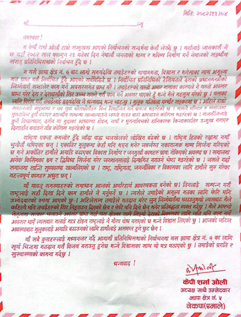 अध्यक्षको पत्रमा फागुन २१ गते नेपाली जनताको भाग्य र भविष्य निर्माण गर्ने दिनको रुपमा मानेर निर्वाचनमा सहभागि हुन आवह्रान गरिएको छ । यो पत्रमा मुुलुक यतिवेला गम्भिर संकटको अवस्थामा रहेको उल्लेख छ । त्यसैले एकतामा बाँधिएको हाम्रो समाजलाई एकै परिवारका बुबा आमा र छोराछोरी बीचमा सम्बन्ध नै बिभाजन गरिदै आएको छ । यसले अविभावक र सन्तान बीचको सम्बन्धमा संकट ल्याइदैछ । क्रमश परिवार कमजोर भएपछि समाज र देशमा नै कमजोर हुन्छ । यसले मुलुकमा नै एकताको संकट ल्याउछ । अध्यक्ष ज्युको पत्रमा यस क्षेत्रका सबै मतदातामा राष्ट्रिय निर्माणका लागि नेकपा एमालेलाई मतदातन गर्न आवह्रान गरिएको छ । पार्टी अध्यक्षको पत्र लिएर जनताको घरघरमा एमालेको समुहगत रुपमा पुगिरहेको छ ।