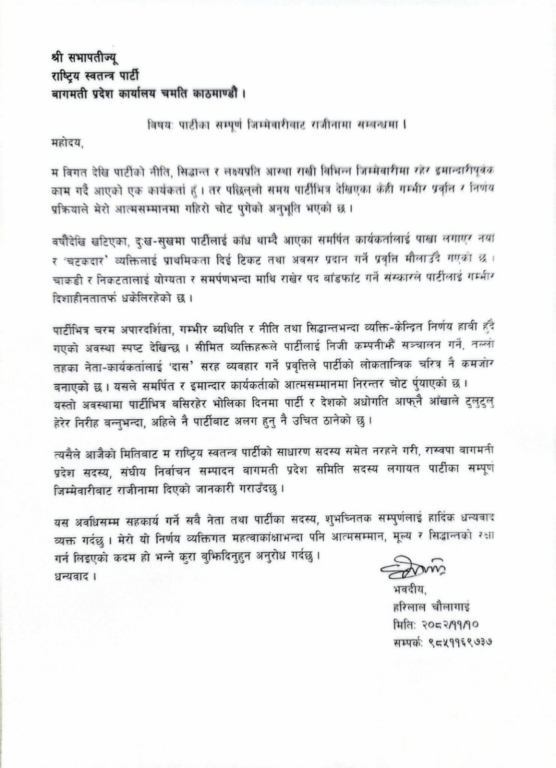 काठमाडौं-राष्ट्रिय स्वतन्त्र पार्टी (रास्वपा)का बागमती प्रदेश समिति सदस्य हरि चौलागाईंले पार्टी परित्याग गर्नुभएको छ।
