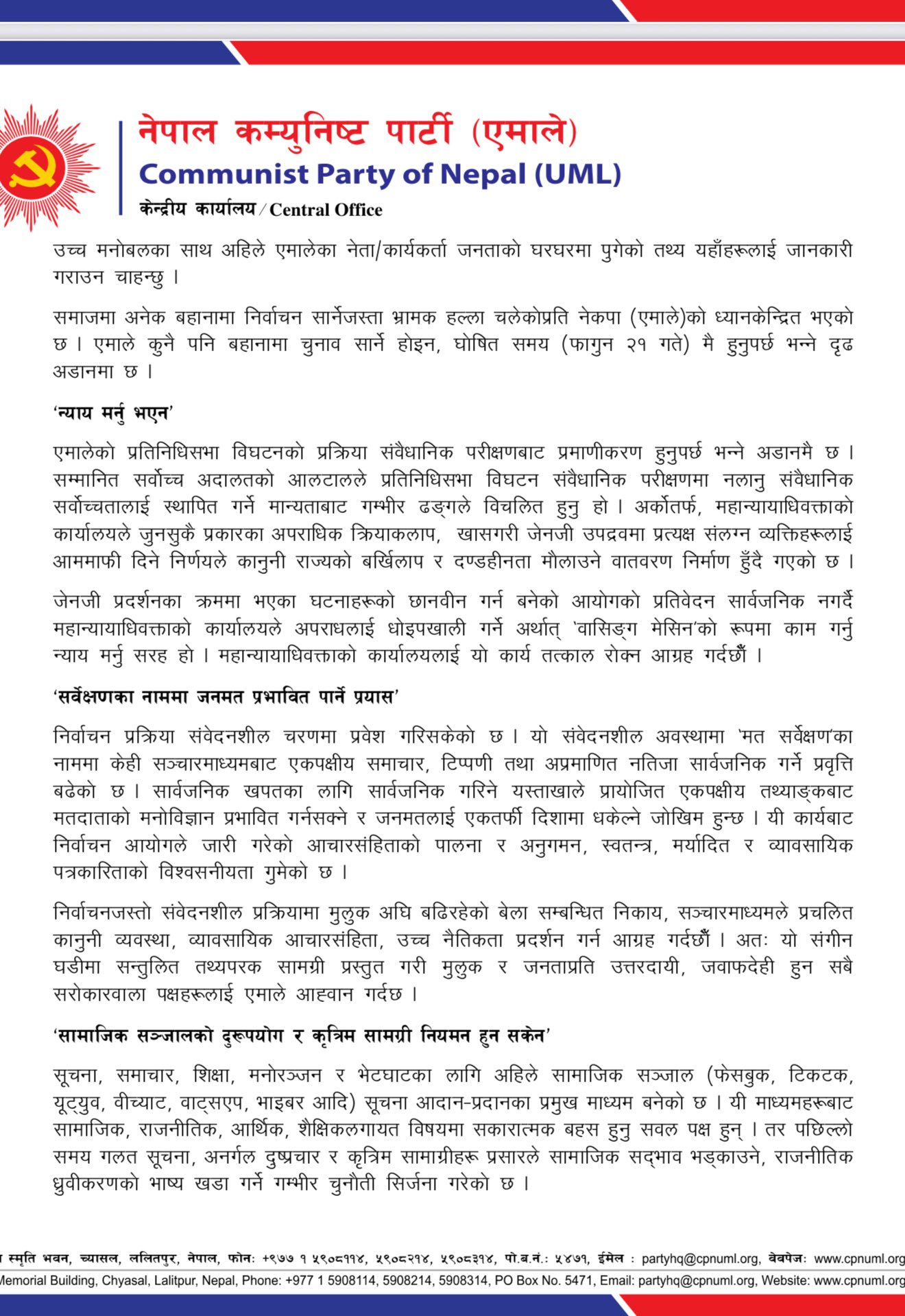 आज पार्टी मुख्यालयमा पत्रकार सम्मेलन गरेर प्रचार विभाग प्रमुख शाहीले निर्वाचन प्रक्रिया संवेदनशील चरणमा प्रवेश गरिसकेको भएपनि मत मत सर्वेक्षणका नाममा जनमत प्रभावित पारिएको भन्दै आपत्ति जनाउनुभयाे। उहाँले भन्नुभयाे, ‘नाममा केही सञ्चारमाध्यमबाट एकपक्षीय समाचार, टिप्पणी तथा अप्रमाणित नतिजा सार्वजनिक गर्ने प्रवृत्ति बढेको छ। सार्वजनिक खपतका लागि सार्वजनिक गरिने यस्ताखाले प्रायोजित एकपक्षीय तथ्याङ्कबाट मतदाताको मनोविज्ञान प्रभावित गर्नसक्ने र जनमतलाई एकतर्फी दिशामा धकेल्ने जोखिम हुन्छ। यी कार्यबाट निर्वाचन आयोगले जारी गरेको आचारसंहिताको पालना र अनुगमन, स्वतन्त्र, मर्यादित र व्यावसायिक पत्रकारिताको विश्वसनीयता गुमेको छ।’
