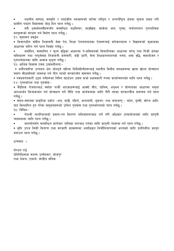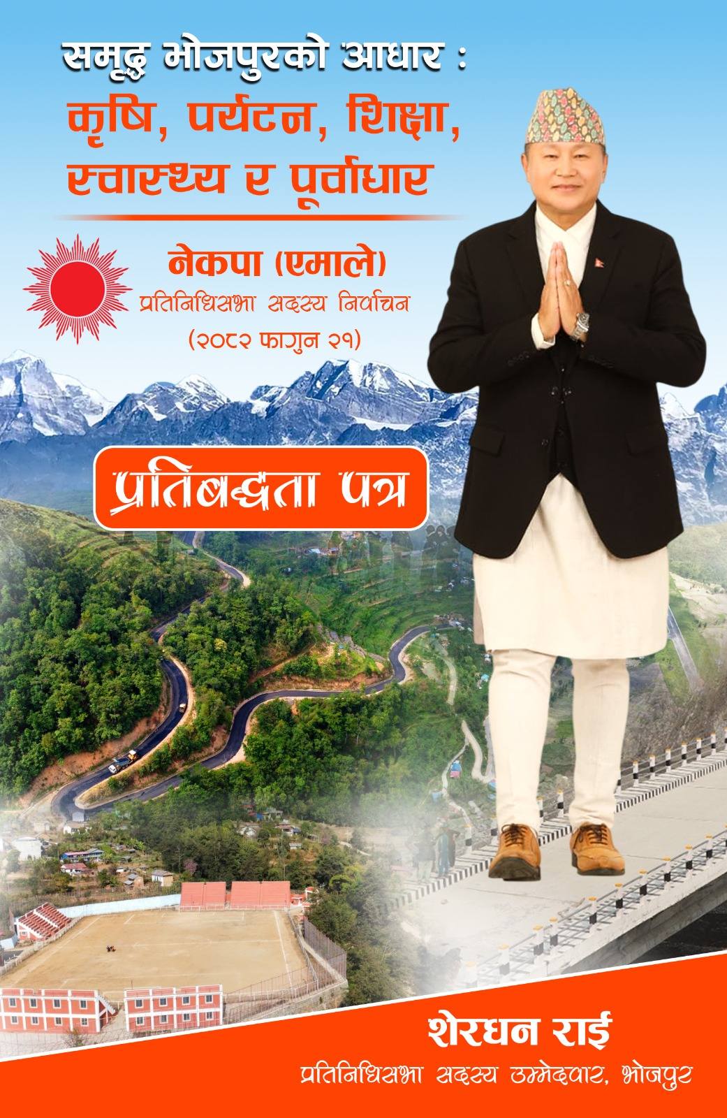 भोजपुर-नेकपा एमालेका सचिव एवं भोजपुरका उम्मेदवार शेरधन राईले प्रतिबद्धता पत्र सार्वजनिक गर्नुभएको छ। भोजपुरका उम्मेदवार राईले विकास निर्माणसम्मका एजेण्डा समेटेर चुनावी प्रतिबद्धतापत्र सार्वजनिक गर्नुभएको हो।