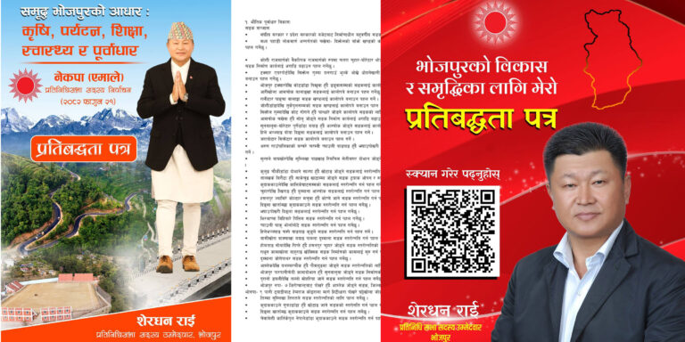 भोजपुर-नेकपा एमालेका सचिव एवं भोजपुरका उम्मेदवार शेरधन राईले प्रतिबद्धता पत्र सार्वजनिक गर्नुभएको छ। भोजपुरका उम्मेदवार राईले विकास निर्माणसम्मका एजेण्डा समेटेर चुनावी प्रतिबद्धतापत्र सार्वजनिक गर्नुभएको हो।