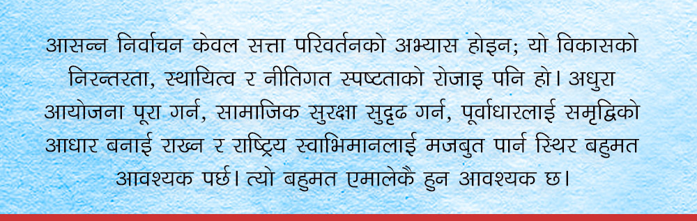 अब थोरै दिनमात्र बाँकी छ, नेपालको लोकतान्त्रिक यात्रामा नीति, स्थिरता र परिणाममुखी शासनबीचको सम्बन्ध कति महत्वपूर्ण छ भन्ने प्रश्नको उत्तर यही निर्वाचनले दिनेछ।