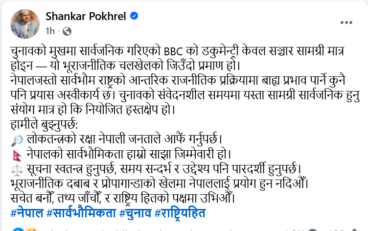 सामाजिक सञ्जाल फेसबुकमा महासचिव पोखरेलले लेख्नुभएकाे छ, ‘चुनावको मुखमा सार्वजनिक गरिएको बीबीसीको डकुमेन्ट्री केवल सञ्चार सामग्री मात्र होइन-यो भूराजनीतिक चलखेलको जिउँदो प्रमाण हो । नेपालजस्तो सार्वभौम राष्ट्रको आन्तरिक राजनीतिक प्रक्रियामा बाह्य प्रभाव पार्ने कुनै पनि प्रयास अस्वीकार्य छ । चुनावको संवेदनशील समयमा यस्ता सामग्री सार्वजनिक हुनु संयोग मात्र हो कि नियोजित हस्तक्षेप हो।’