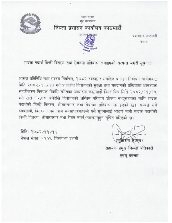 काठमाडौँका सहयाक प्रमुख जिल्ला अधिकारी मुक्तिराम रिजालले जारी गरेको सूचनामा भनिएको छ, ‘काठमाडौँ जिल्लाभित्र मिति २०८२/११/१५ गते राति १२ बजेदेखि निर्वाचनको अन्तिम परिणाम घोषणा नभएसम्मका लागि मादक पदार्थको बिक्री वितरण, ओसारपसार तथा सेवनमा प्रतिबन्ध लगाइएको छ।’