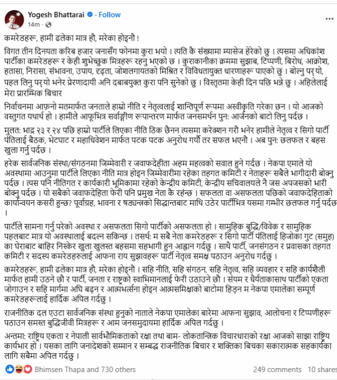 उपमहासचिव भट्टराईले सोमबार सामाजिक सञ्जालमा स्ट्याटस लेख्दै नेकपा एमाले यो अवस्थामा आउनुमा पार्टीले लिएका नीति मात्र होइन जिम्मेवारीमा रहेका तहगत कमिटी र नेताहरू सबैले भागीदारी बोक्नुपर्ने बताउनुभएको छ।