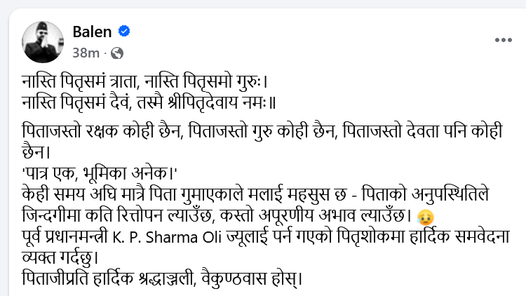‘पिताजस्तो रक्षक कोही छैन, पिताजस्तो गुरू कोही छैन, पिताजस्तो देवता पनि कोही छैन। पात्र एक, भूमिका अनेक। केही समय अघि मात्रै पिता गुमाएकाले मलाई महसुस छ। पिताको अनुपस्थितिले जिन्दगीमा कति रित्तोपन ल्याउँछ, कस्तो अपूरणीय अभाव ल्याउँछ,’ नेता बालेनले लेखेका छन्, ‘पूर्व प्रधानमन्त्री केपी शर्मा ओली ज्यूलाई पर्न गएको पितृशोकमा हार्दिक समवेदना व्यक्त गर्दछु। पिताजीप्रति हार्दिक श्रद्धाञ्जली, वैकुण्ठवास होस्।’ केही समयअघि मात्रै नेता बालेनका बुबाको समेत निधन भएको थियो ।