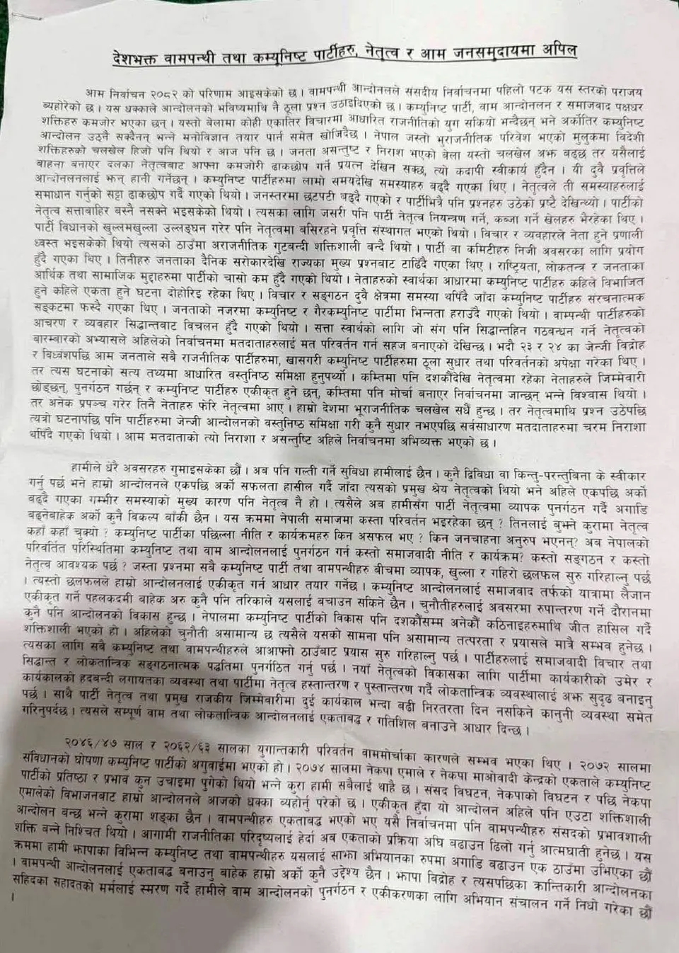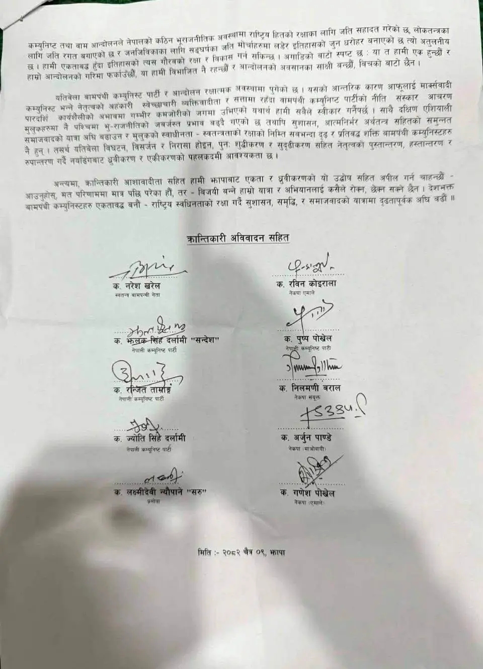 त्यसैगरी, वामपन्थी शक्तिहरूबीच एकता अपरिहार्य रहेको निष्कर्ष निकाल्दै साझा विचार, कार्यक्रम र नेतृत्व विकासमा जोड दिइएको छ। अपिलमा आगामी दिनमा वाम आन्दोलनलाई पुनः सशक्त बनाउन एकता, रूपान्तरण र सुदृढीकरण अभियान सञ्चालन गरिने उल्लेख गरिएको छ।