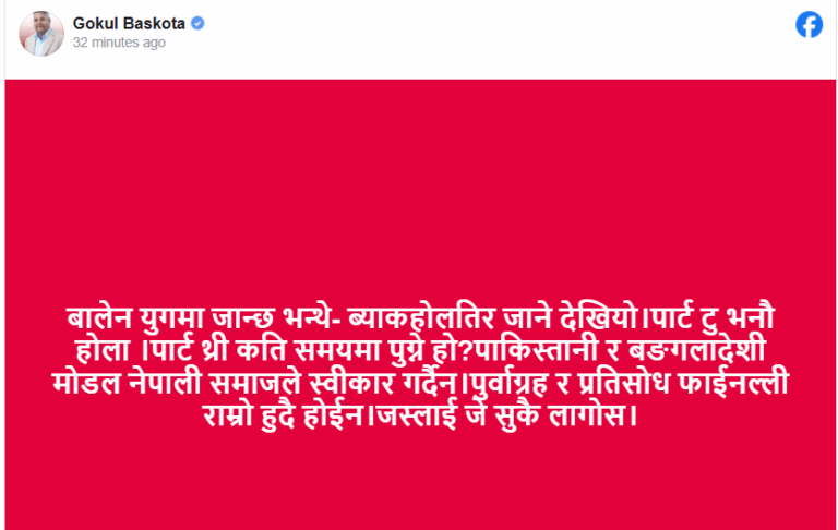 सामाजिक सञ्जालमा नेता बास्कोटाले लेखेका छन्– ‘बालेन युगमा जान्छ भन्थे–ब्याकहोलतिर जाने देखियो। पार्ट टु भनौँ होला । पार्ट थ्री कति समयमा पुग्ने हो ? पाकिस्तानी र बङ्गलादेशी मोडल नेपाली समाजले स्वीकार गर्दैन।’