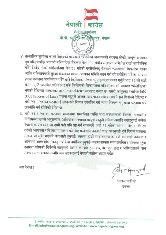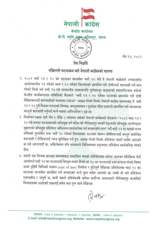 ‘भदौ २३ र २४ का घटनाका सम्बन्धमा सम्बन्धित व्यक्ति तथा संस्थाहरूको निष्पक्ष, पारदर्शी र विधिसम्मत ढंगले अनुसन्धान, अभियोजन लगायत सम्पूर्ण कानुनी प्रक्रिया अगाडि बढाइनुपर्छ भन्नेमा नेपाली कांग्रेस स्पष्ट छ,’ विज्ञप्तिमा भनिएको, ‘हामी प्रष्ट गर्न चाहान्छौँ– भदौ २३ गतेको घटनामा संलग्न सँगै २४ गतेको आगजनी र विध्वंशमा संलग्न को थिए भन्ने पनि जनताले थाहा पाउनुपर्छ।’