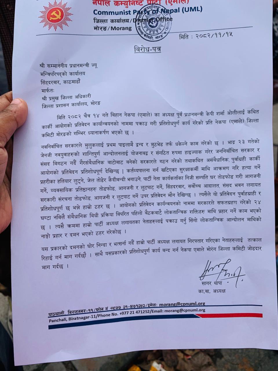 जिल्ला प्रशासन कार्यालयमा पुगेपछि प्रतिनिधिमण्डलले प्रमुख जिल्ला अधिकारीमार्फत नेपाल सरकारलाई सम्बोधन गरिएको ज्ञापनपत्र बुझाएको हो। ज्ञापनपत्रमा ओलीको गिरफ्तारीप्रति आपत्ति जनाउँदै उक्त कदमलाई राजनीतिक प्रतिशोधका रूपमा चित्रण गरिएको छ।