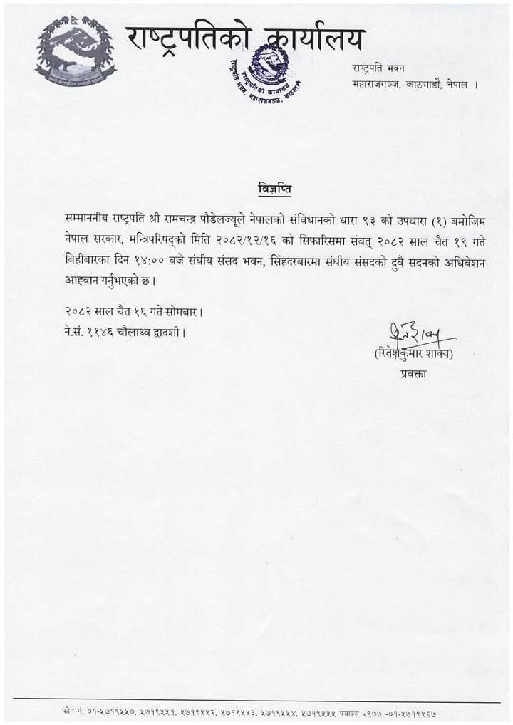 चैत १६ गते साेमबार बसेको मन्त्रिपरिषद् बैठकले चैत १९ गते संसद्को अधिवेशन आह्वान गर्न राष्ट्रपतिसमक्ष आह्वान गर्ने निर्णय गरेको थियो। सोही निर्णयका आधारमा राष्ट्रपति पौडेलले अधिवेशन आह्वान गरेको राष्ट्रपति कार्यालयका प्रवक्ता रितेशकुमार शाक्यले जानकारी दिए ।
