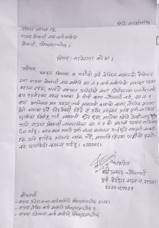 राप्रपाका पूर्व केन्द्रीय सदस्यसमेत रहेका र हाल सिन्धुपाल्चोकको मेलम्ची नगरसमिति वडा नम्बर १ का वडाध्यक्ष बद्रीप्रसाद चौलागाईले पदबाट राजीनामा दिएको घोषणा गरेका हुन् ।