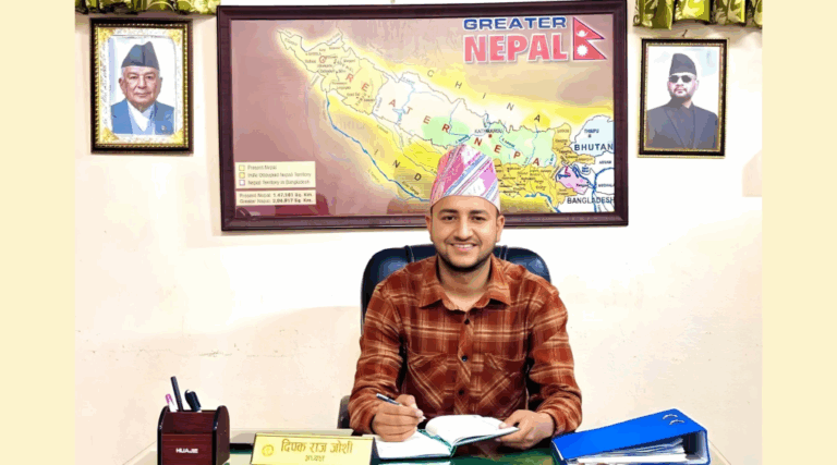 काठमाडौं- प्रधानमन्त्री बालेन शाहलाई स्मरण गराउँदै स्ववियु अध्यक्ष दीपक जोशीले कार्यकक्षमा ग्रेटर नेपालको नक्सा राखेका छन् ।
