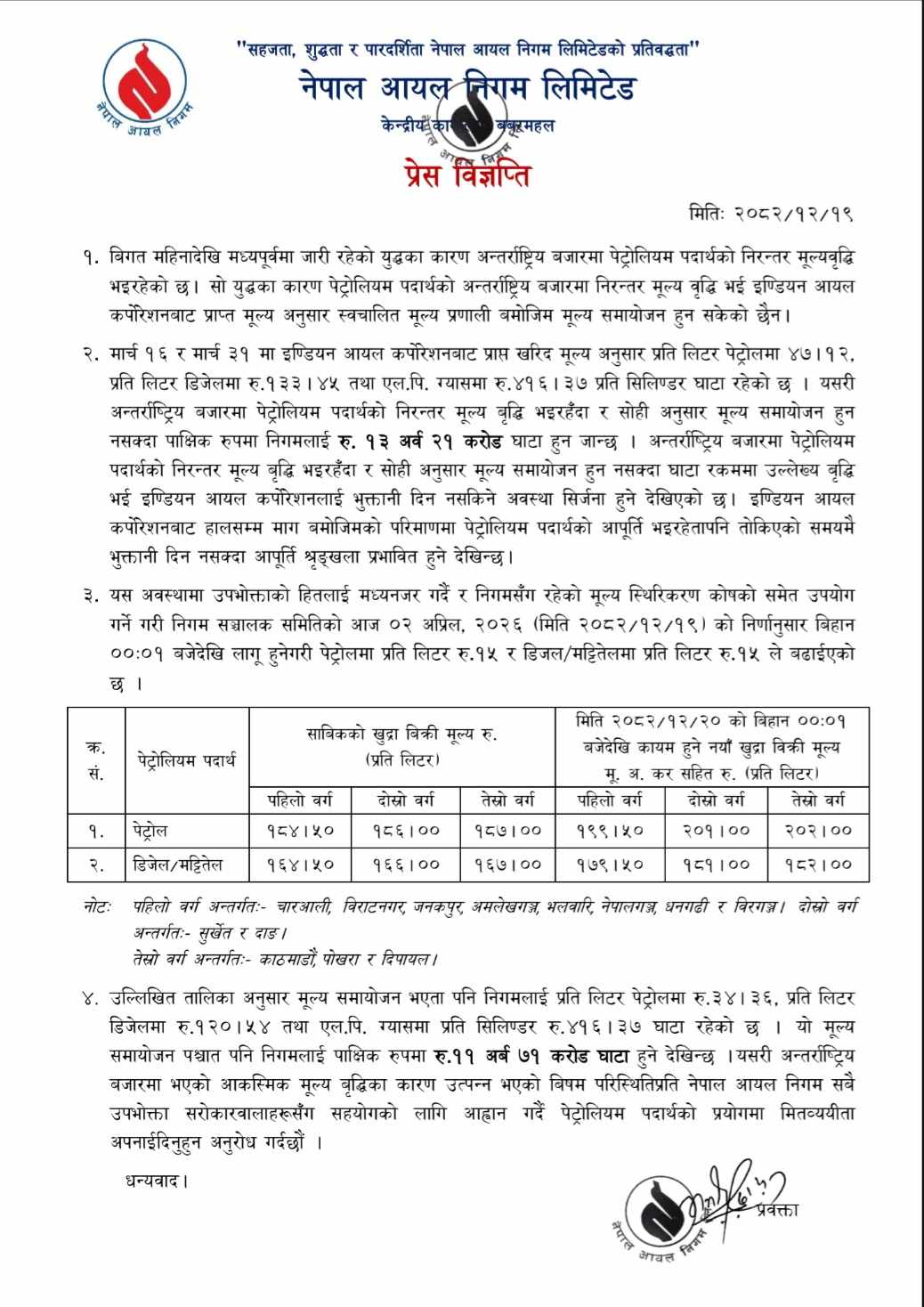 नयाँ वृद्धि गरिएको मूल्य अनुसार अब तेस्रो वर्ग अर्थात काठमाडौं, पोखरा र दिपायलमा पेट्रोलको मूल्य प्रतिलिटर २०२ रुपैयाँ पुगेको छ। यसअघि १८७ रुपैयाँ थियो । यी तीन ठाउँमा यसअघि डिजेल र मट्टितेलको मूल्य १६७ रुपैयाँ लिटर रहेकामा अब १८२ रुपैयाँ पुगेको छ।