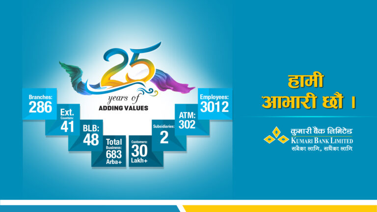 काठमाडौं-कुमारी बैंक लिमिटेडले विभिन्न कार्यक्रमहरु आयोजना गरेर आफ्नो २५ औं वार्षिकोत्सव मनाएको छ। यस वार्षिकोत्सवको अवसरमा कुमारी बैंकले आफ्ना सम्पूर्ण ग्राहक वर्ग, शेयरधनी, नियामक निकाय तथा शुभचिन्तकहरुलाई कृतज्ञता ज्ञापन गर्दैे आफ्नो सफलतामा महत्वपूर्ण भूमिका निर्वाह गर्नु हुने सम्पूर्ण ग्राहकवर्गहरुको सहयोग तथा विश्वासप्रति हार्दिक आभार व्यक्त गरेको छ ।