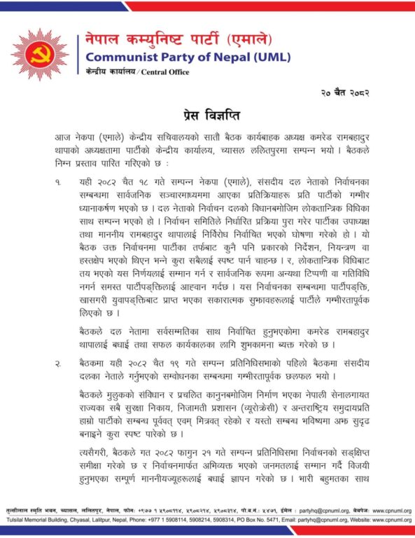 पार्टीको केन्द्रीय सचिवालय बैठकले पार्टीका उपाध्यक्ष एवं संसदीय दलका नेता रामबहादुर थापाले संसदमा दिएको अभिव्यक्तिमा गम्भिर छलफल गर्दै सो निर्णय गरेको हो । ‘बैठकले मुलुकको संविधान र प्रचलित कानुनबमोजिम निर्माण भएका नेपाली सेनालगायत राज्यका सबै सुरक्षा निकाय, निजामती प्रशासन (व्यूरोक्रेसी) र अन्तराष्ट्रिय समुदायप्रति हाम्रो पार्टीको सम्बन्ध पूर्ववत् एवम् मित्रवत् रहेको र यस्तो सम्बन्ध भविष्यमा अझ सुदृढ बनाइने कुरा स्पष्ट पारेको छ ’ बैठकपछि महासचिव शंकर पोखरेलले जारी गरेको विज्ञप्तीमा उल्लेख छ ।