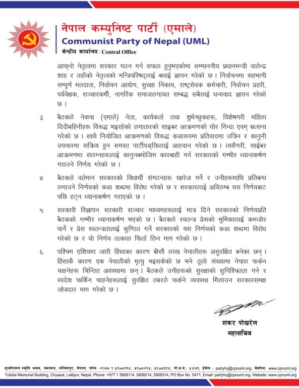 पछिल्ला दिनमा एमालेका कार्यकर्ता खासगरी महिलाहरुप्रति लक्षित गरेर व्यापक रुपमा भइरहेको साइबर हमलाप्रति आपत्ती प्रकट गरेको छ । यस्तो अशिष्ट व्यबहारको साइबर हमलाको प्रतिवाद गर्न र कानुनी उपचार गर्न सम्पूर्ण पार्टीपंक्तीलाई एमालेले आग्रह गरेको छ । एमालेले साइबर अपराधीलाई कानुनी कारबाही गर्न सरकारसँग माग पनि गरेको छ ।