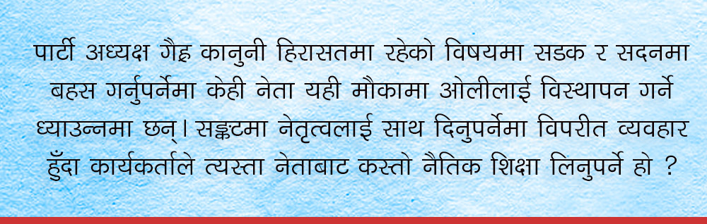 निर्वाचन परिणामपछि एमालेभित्र देखिएको अवस्था हेरेर ईमान्दार नेता तथा कार्यकर्ता मौन बसिरहनु सम्भव छैन। पहिलो त लोकतन्त्रको पक्षमा वकालत गर्ने पार्टीको नेतृत्व नै गैर लोकतान्त्रिक ढङ्गले राखिएको थुनाबाट मुक्त गराउन सबै एक गठ भएर न्यायालय, सदन र सडक सबै क्षेत्रबाट लोकतन्त्रको रक्षाको लागि लड्न जरुरी छ। अहिलेको अवस्थामा नेतृत्व परिवर्तनबारेको बहस चलाएर ओली गिरफ्तारी ठीक भन्ने सन्देश जानेगरी दुनियाँलाई हँसाउने काम नेताहरुले नगर्दा राम्रो हुन्। जुन पार्टीले आफ्नो मुल नेतृत्वको संरक्षण गर्न सक्दैन त्यसले कार्यकर्ता र जनताको के संरक्षण गर्छ ?