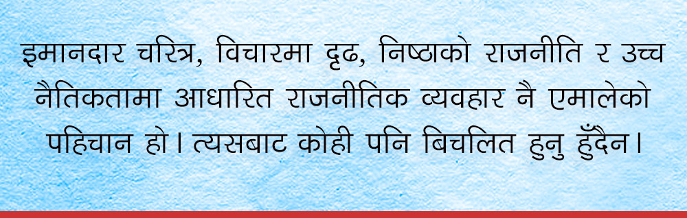 एमालेभित्र देखिएको निराशालाई आशामा रुपान्तरण गर्न पार्टीले हिजोको आफ्नो मूल चरित्र कायम राख्नु पर्दछ। इमानदार चरित्र, विचारमा दृढ, निष्ठाको राजनीति र उच्च नैतिकतामा आधारित राजनीतिक व्यवहार नै एमालेको पहिचान हो। त्यसबाट कोही पनि बिचलित हुनु हुँदैन। त्यो एमालेपन कहाँ कहाँबाट हराएको हो त्यहींबाट खोज्नु पर्दछ। चरित्र त्याग्नेहरु आदर्शका गीत गाउन बन्द गर्नु पर्छ। अनि हवाई कार्यालय र पार्टीको कार्यालयबाट खादा र माला संस्कृति हटाउँदै अघि बढ्नुपर्छ। बेठिकलाई ठीकमा बदलौं। मेरो कारणले एमाले कमजोर भएका भन्दै सबैले म म भन्दै अघि बढ्नुपर्दछ। अहिले नै विशेष महाधिवेशन नयाँ नेतृत्व, हस्तान्तरण वा पुस्तान्तरण जस्ता कुराले उत्तेजित गराउँदै विग्रहतिर बढ्नु उचित हुँदैन ।