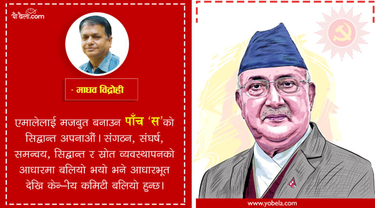 एमालेभित्र देखिएको निराशालाई आशामा रुपान्तरण गर्न पार्टीले हिजोको आफ्नो मूल चरित्र कायम राख्नु पर्दछ। इमानदार चरित्र, विचारमा दृढ, निष्ठाको राजनीति र उच्च नैतिकतामा आधारित राजनीतिक व्यवहार नै एमालेको पहिचान हो। त्यसबाट कोही पनि बिचलित हुनु हुँदैन। त्यो एमालेपन कहाँ कहाँबाट हराएको हो त्यहींबाट खोज्नु पर्दछ। चरित्र त्याग्नेहरु आदर्शका गीत गाउन बन्द गर्नु पर्छ। अनि हवाई कार्यालय र पार्टीको कार्यालयबाट खादा र माला संस्कृति हटाउँदै अघि बढ्नुपर्छ। बेठिकलाई ठीकमा बदलौं। मेरो कारणले एमाले कमजोर भएका भन्दै सबैले म म भन्दै अघि बढ्नुपर्दछ। अहिले नै विशेष महाधिवेशन नयाँ नेतृत्व, हस्तान्तरण वा पुस्तान्तरण जस्ता कुराले उत्तेजित गराउँदै विग्रहतिर बढ्नु उचित हुँदैन ।