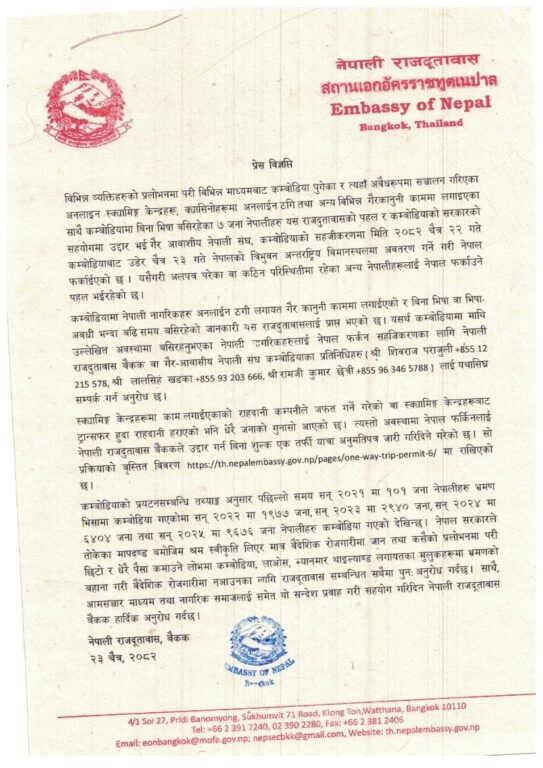 कठिन अवस्थामा रहेका र नेपाल फर्कन चाहने नेपाली नागरिकलाई सहजीकरणका लागि तत्काल सम्पर्क गर्न दूतावासले आग्रह गरेको छ । अलपत्र परेकाहरूले बैंककस्थित नेपाली राजदूतावास वा गैरआवासीय नेपाली संघ कम्बोडियाका प्रतिनिधिहरू शिवराज पराजुली, लालसिंह खड्का र रामजीकुमार क्षेत्रीलाई सम्पर्क गर्न सक्नेछन् ।