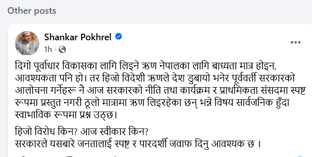 सामाजिक सञ्जाल फेसबुकमा लेख्दै महासचिव पोखरेलले दिगो पूर्वाधार विकासका लागि लिइने विदेशी ऋण नेपालका लागि बाध्यता मात्र नभई आवश्यकता पनि भएको उल्लेख गरे । तर, अघिल्लो सरकारको समयमा विदेशी ऋणकै विषयलाई लिएर कडा आलोचना गर्नेहरू अहिले आफैले ठूलो मात्रामा ऋण लिन थालेको उनको टिप्पणी छ ।
