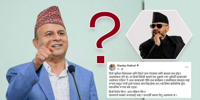 ‘हिजो विदेशी ऋणले देश डुबायो भनेर पूर्ववर्ती सरकारको आलोचना गर्नेहरू नै आज सरकारको नीति तथा कार्यक्रम र प्राथमिकता संसदमा स्पष्ट रूपमा प्रस्तुत नगरी ठूलो मात्रामा ऋण लिइरहेका छन् भन्ने विषय सार्वजनिक हुँदा स्वाभाविक रूपमा प्रश्न उठ्छ। हिजो विरोध किन ? आज स्वीकार किन ?’ महासचिव पोखरेलको प्रश्न छ।