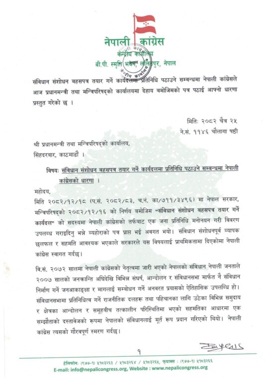 सरकारले कांग्रेसलाई मन्त्रिपरिषद्को निर्णयअनुसार संविधान संशोधन बहसपत्र तयार गर्ने कार्यदलमा एक जना प्रतिनिधि मनोनयन गर्न भनेको थियो।