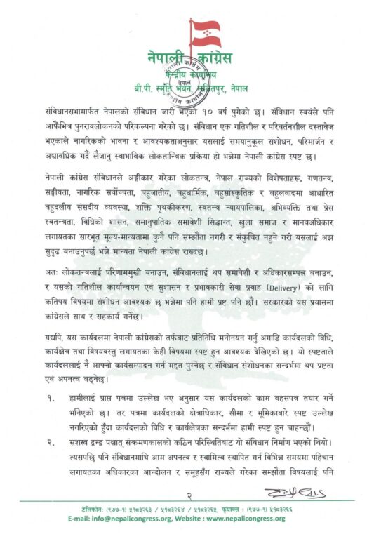 अत: नेपाल सरकारले संविधान संशोधन बहसपत्र तयार गर्नुको सान्दर्भिकता, यसको विधि, क्षेत्राधिकार र सीमा, यसले हासिल गर्न खोजेको राजनीतिक र संवैधानिक लक्ष्य र संविधानका आधारभूत विषयवस्तु एवं संशोधनका प्रावधानहरूका बारेमा आफ्नो प्रारम्भिक धारणा सार्वजनिक गरी स्पष्ट हुन सकेमा संविधान संशोधन जस्तो संवेदनशील विषयमा बहसपत्र तयार गर्ने कार्यदलमा पार्टीको सहभागिता सार्थक हुन्छ र आम अपनत्व पनि हुन्छ भन्नेमा नेपाली कांग्रेसको विश्वास रहेको छ। सरकारको यस प्रयासमा कांग्रेसको साथ र सहयोग रहनेछ।