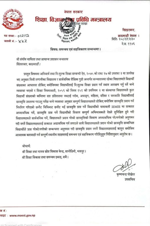 साथै छात्रवृत्ति प्राप्त गर्ने विद्यार्थीको विवरण सम्पूर्ण अभिभावकले देख्ने सुनिश्चित हुने गरी विद्यालयहरुले सार्वजनिक गर्ने तथा विद्यालयले प्रदान गरेको छात्रवृत्तिको विवरण अध्यावधिक गरे/नगरेको अनुगमन गरी नगर्ने विद्यालयलाई तत्काल अद्यावधिक गर्न लगाउने पत्रमा भनिएको छ ।