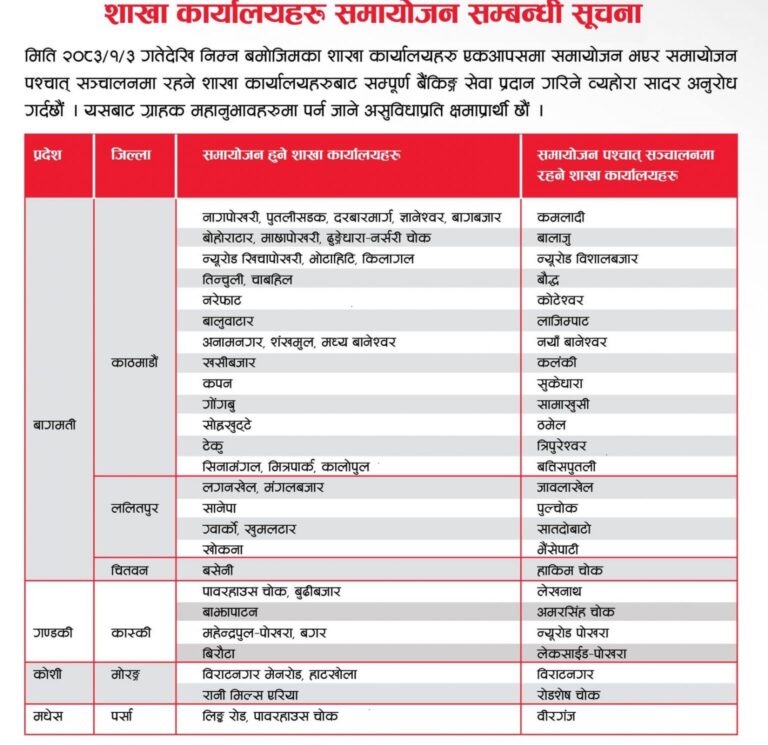 साथै, मोरङमा रहेको विराटनगर मेनरोड, हाटखोला, रानी मिल्स एरिया र पर्सामा रहेको लिंक रोड, पावरहाउस चोकमा रहेको शाखा कार्यालय पनि गाभ्ने भएको छ। यसरी काठमाडौं, ललितपुर, चितवन, कास्की, मोरङ र पर्सा जिल्लामा रहेका ठुला संख्याका शाखा कार्यालय बन्द भएका छन्।