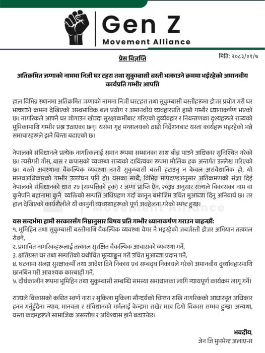 काठमाडौँ-सरकारले अतिक्रमित जग्गा खाली गराउने नाममा निजी घरटहरा र सुकुम्बासी बस्तीहरूमा डोजर चलाइएको र यस क्रममा अमानवीय व्यवहार प्रदर्शन गरिएको भन्दै जेनजी मुभमेन्ट अलायन्सले गम्भीर आपत्ति जनाएको छ। अलायन्सले एक प्रेस विज्ञप्ति जारी गर्दै गृह मन्त्रालयको ठाडो निर्देशनमा भइरहेको भनिएको यस्तो बल प्रयोगले नागरिकको बाँच्न पाउने संवैधानिक हकको हनन गरेको ठहर गरेको हो।