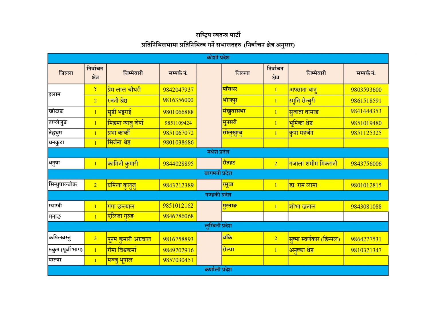 सूचनामा भनिएको छ, ‘राष्ट्रिय स्वतन्त्र पार्टीले प्रत्यक्ष निर्वाचन मा विजय प्राप्त गर्न नसकेका क्षेत्रहरूको लागि समानुपातिक सांसदको सूचीबाट जिम्मेवारी तोकेको छ र सो जिम्मेवारीको सूची आमसञ्चार माध्यम मार्फत आम नागरिक तहमा जानकारीको लागि प्रेषित गरिएको छ।’