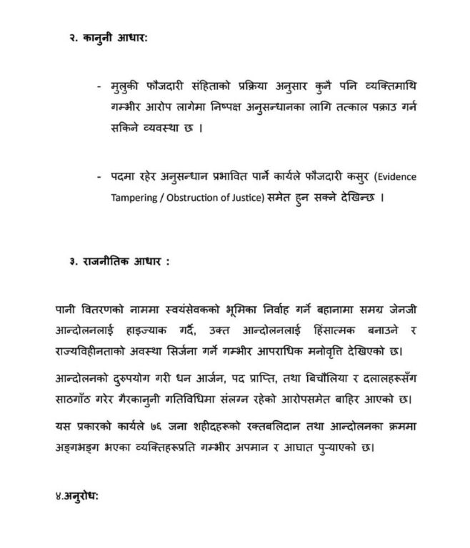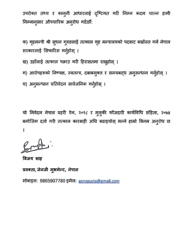 संगठनका प्रवक्ता विजय शाहद्वारा हस्ताक्षरित उजुरी इमेलमार्फत् नक्सालस्थित नेपाल प्रहरी प्रधान कार्यालयमा पठाइएको हो। निवेदनमा सरकारलाई गृहमन्त्रीलाई पदबाट हटाउन सिफारिस गर्न, उनलाई पक्राउ गरी हिरासतमा राख्न, आरोपहरूको निष्पक्ष र स्वतन्त्र अनुसन्धान गर्न तथा प्रतिवेदन सार्वजनिक गर्न माग गरिएको छ.।